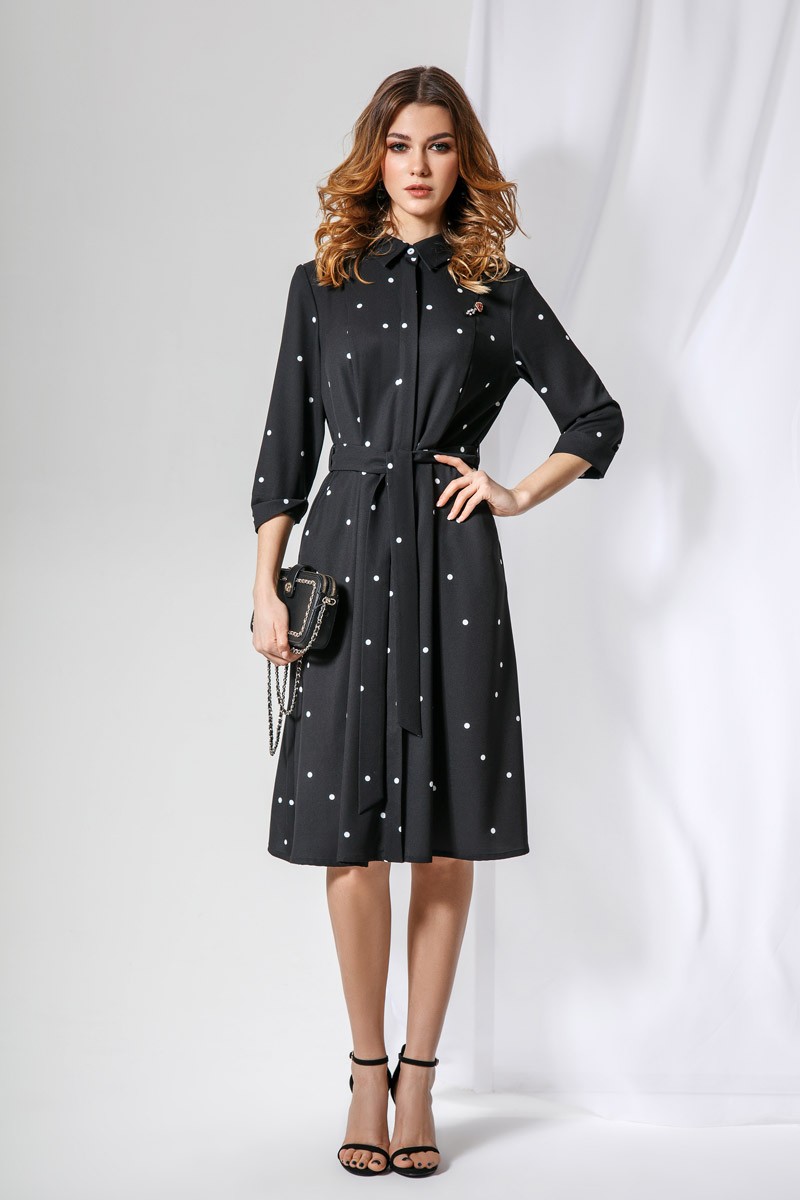 Стильное женское платье полуприлегающего силуэта, выполнено из плательной ткани с добавлением вискозы с модным принтом в горох. Платье отрезное по линии талии, с застежкой по переду на пуговицы прикрытую потайной планкой. В боковых швах функциональные карманы, в комплект входит пояс из основной ткани. Модель платья декорирована пришивным дизайнерским украшением ручной работы. Платье удобное и комфортное, прекрасно подойдет для ежедневной носки и торжественных мероприятий, вы будете выглядеть роскошно.