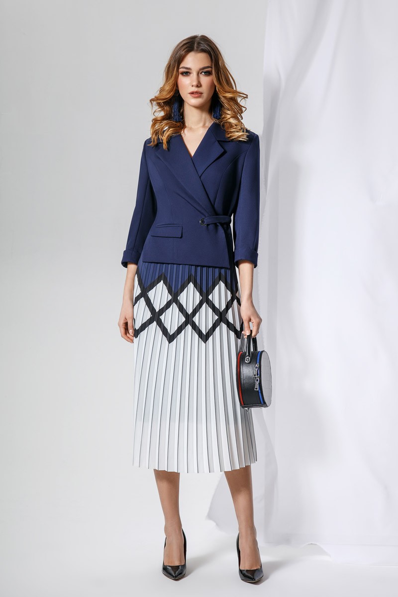 Эффектное платье, выполнено в стиле имитации костюма, состоящего из жакета и юбки. Верхняя часть платья выполнена из высококачественной костюмной ткани с добавлением вискозы, по переду на запах, с застежкой на пояс из основной ткани протянутый через люверс и застегивающийся на пуговицу. Жакет полностью на трикотажной подкладке. Юбка выполнена из плиссированной ткани с модным дизайнерским принтом, в боковом шве потайная молния застежка. Юбка с трикотажной подкладкой. Платье удобное и комфортное, прекрасно подойдет для ежедневной носки и торжественных мероприятий, вы будете выглядеть роскошно.