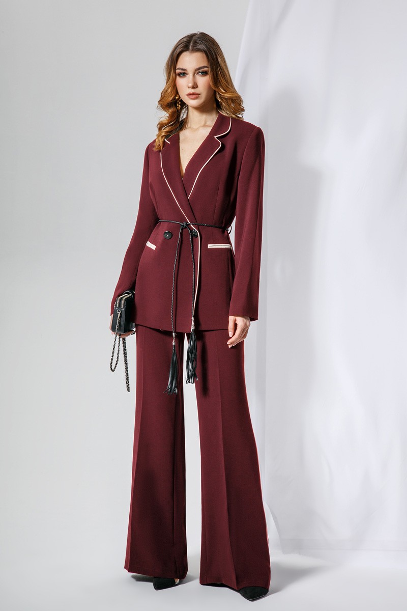 Стильный женский костюм, состоит из жакета и брюк. Жакет полуприлегающего силуэта, выполнен из высококачественной костюмной ткани с добавлением вискозы. Жакет полностью на подкладке, с застежкой на две пуговицы. Перед жакета декорирован кантом и имитацией рамок карманов. Брюки прямые, расклешенные к низу, на поясе, с застежкой на пуговицу и молнию. В комплект входит пояс ручной работы. Модель удобная и практичная, прекрасно подойдет для ежедневной носки и торжественного мероприятия.