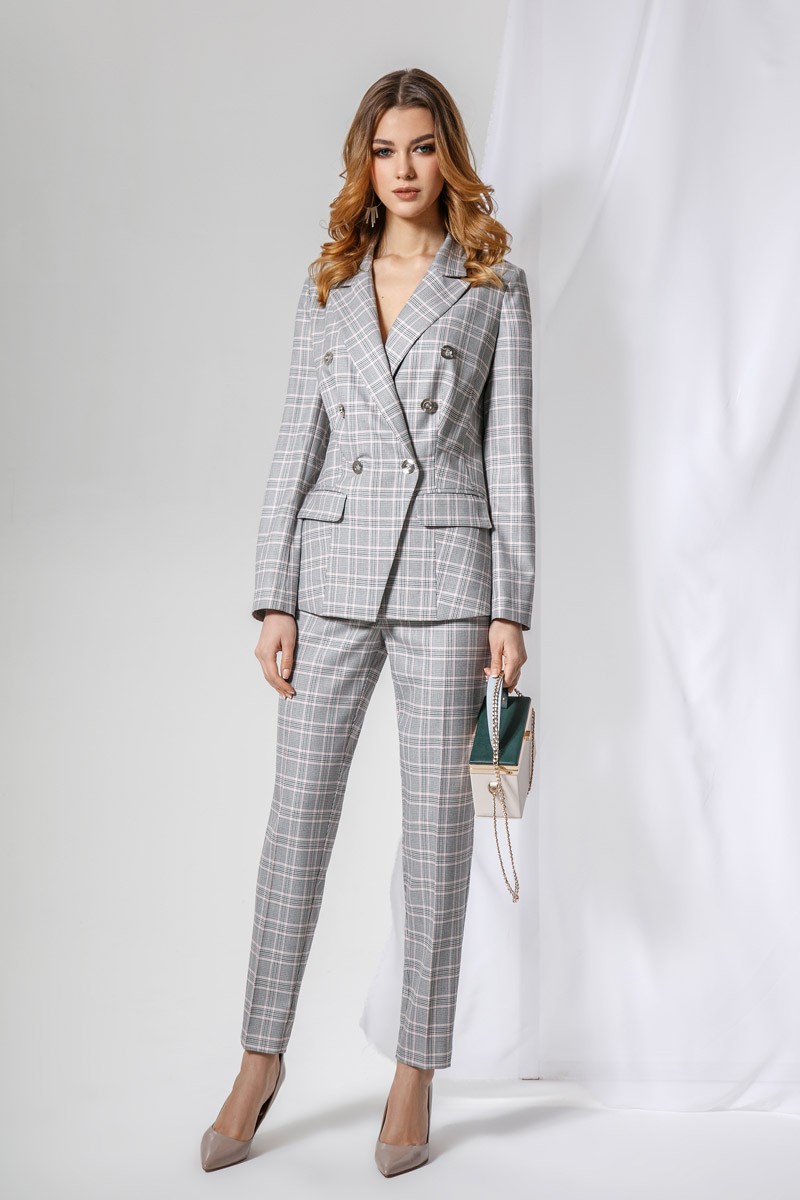 Жакет полуприлегающего силуэта, выполнен из высококачественной костюмной ткани в клетку, с добавлением вискозы. Жакет двубортный, с застежкой по переду на пуговицы. Рукава втачные.